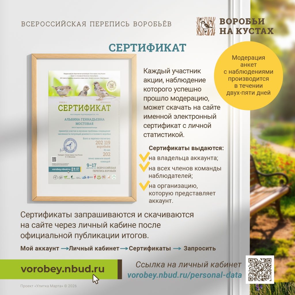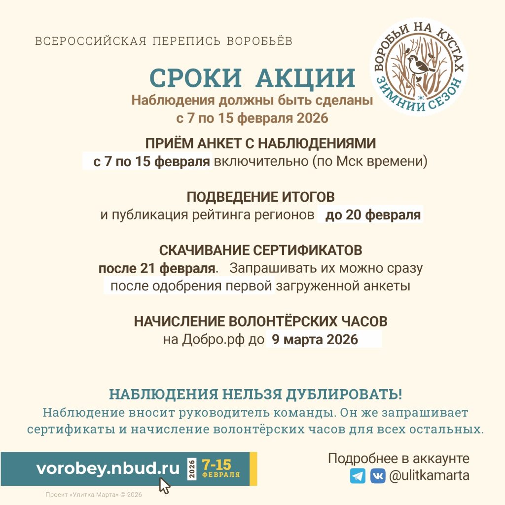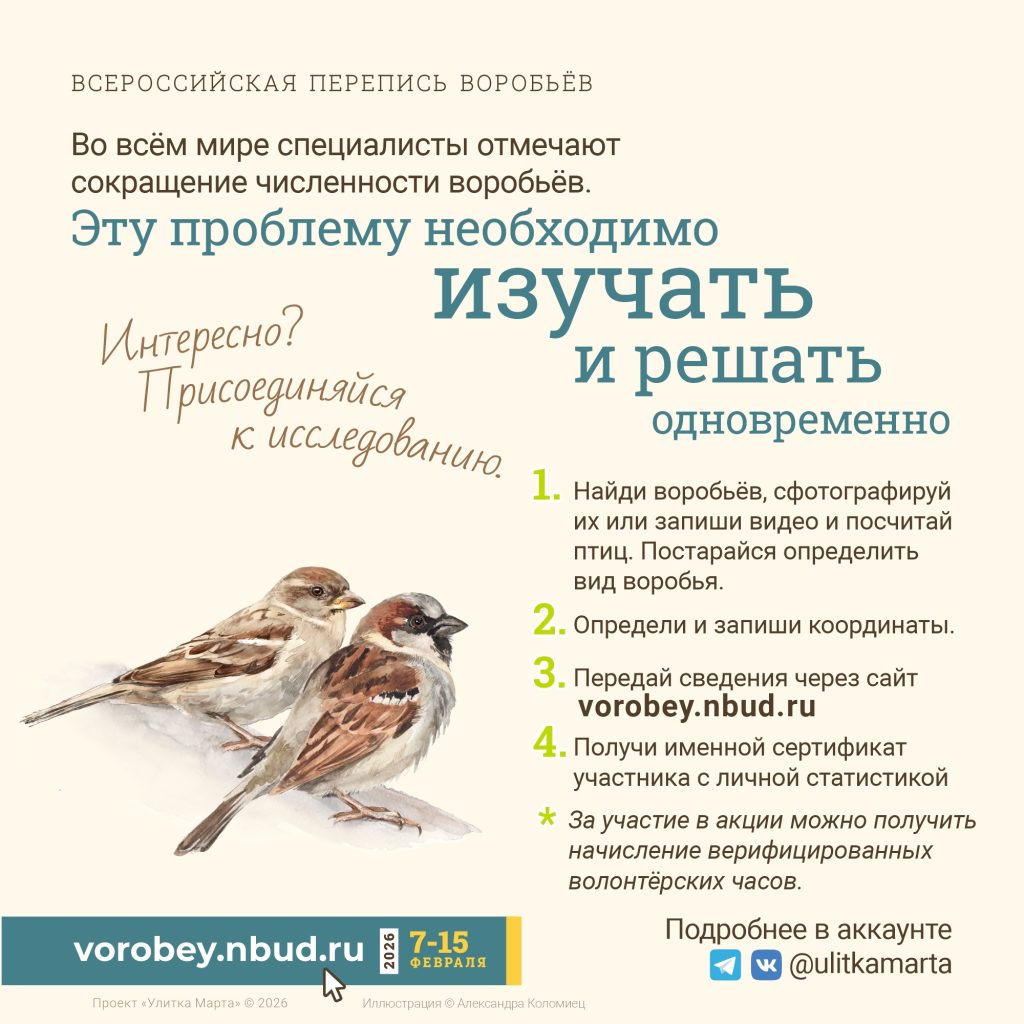 С 7 по 15 февраля 2026 г. найти воробьиный куст и/или посчитать количество встреченных во время прогулки воробьёв, сфотографировать наблюдение на каждой точке встречи, определить и запомнить координаты места встречи и ответственно внести ВСЕ эти данные на сайт мероприятия vorobey.nbud.ru.