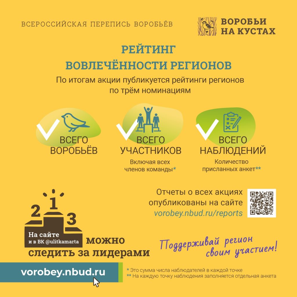 По итогам Переписи будет опубликован РЕЙТИНГ вовлечённости РЕГИОНОВ по номинациям: число воробьёв; число участников; число точек наблюдений. Будьте активны, поддерживайте свой регион! Самые активные участники из регионов-лидеров могут получить сувенирную продукцию с символикой акции.